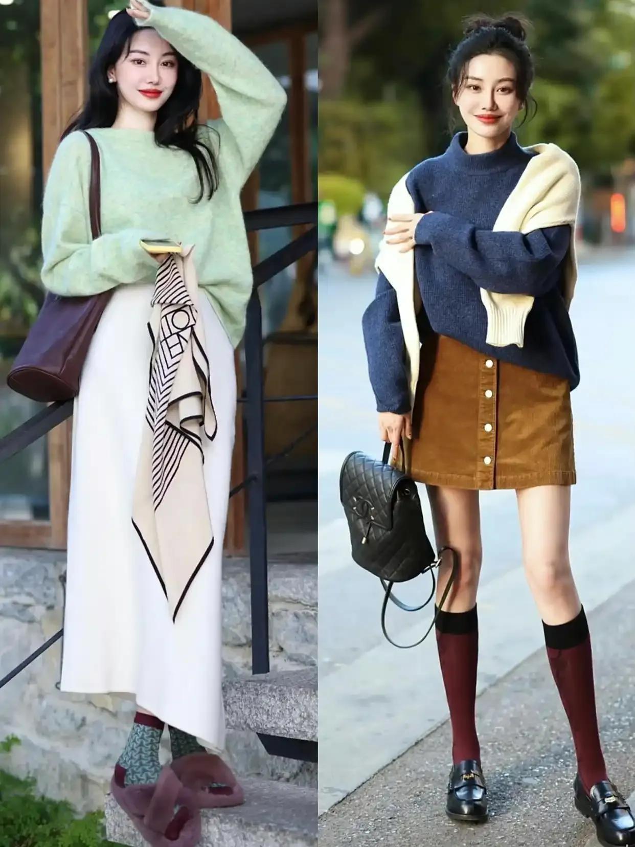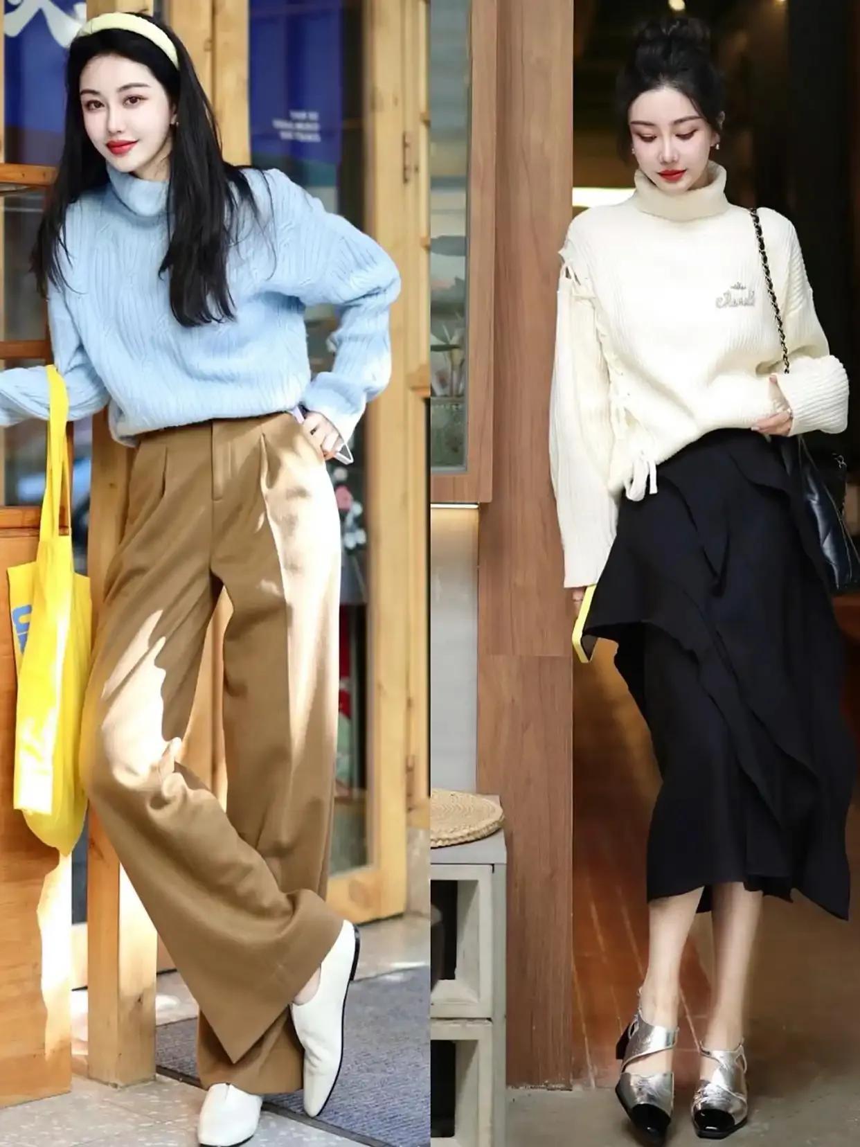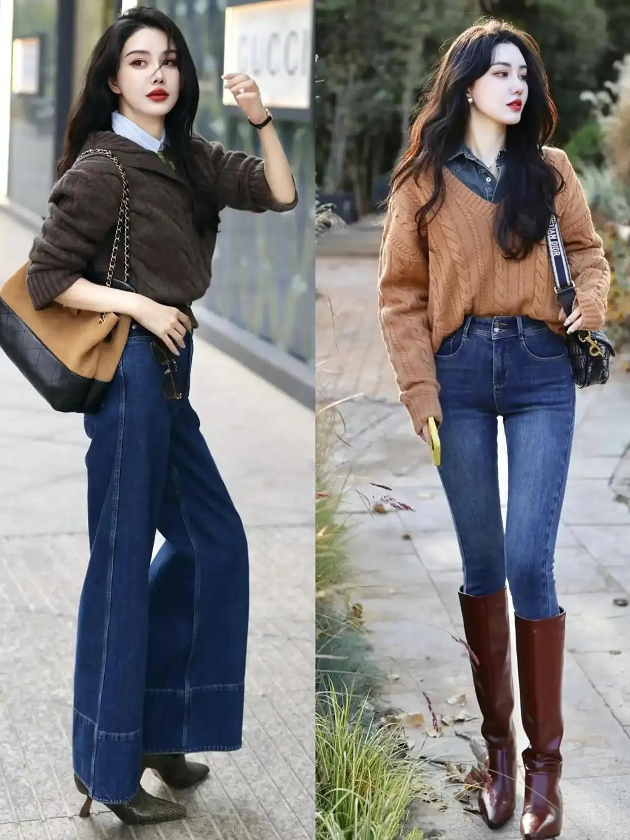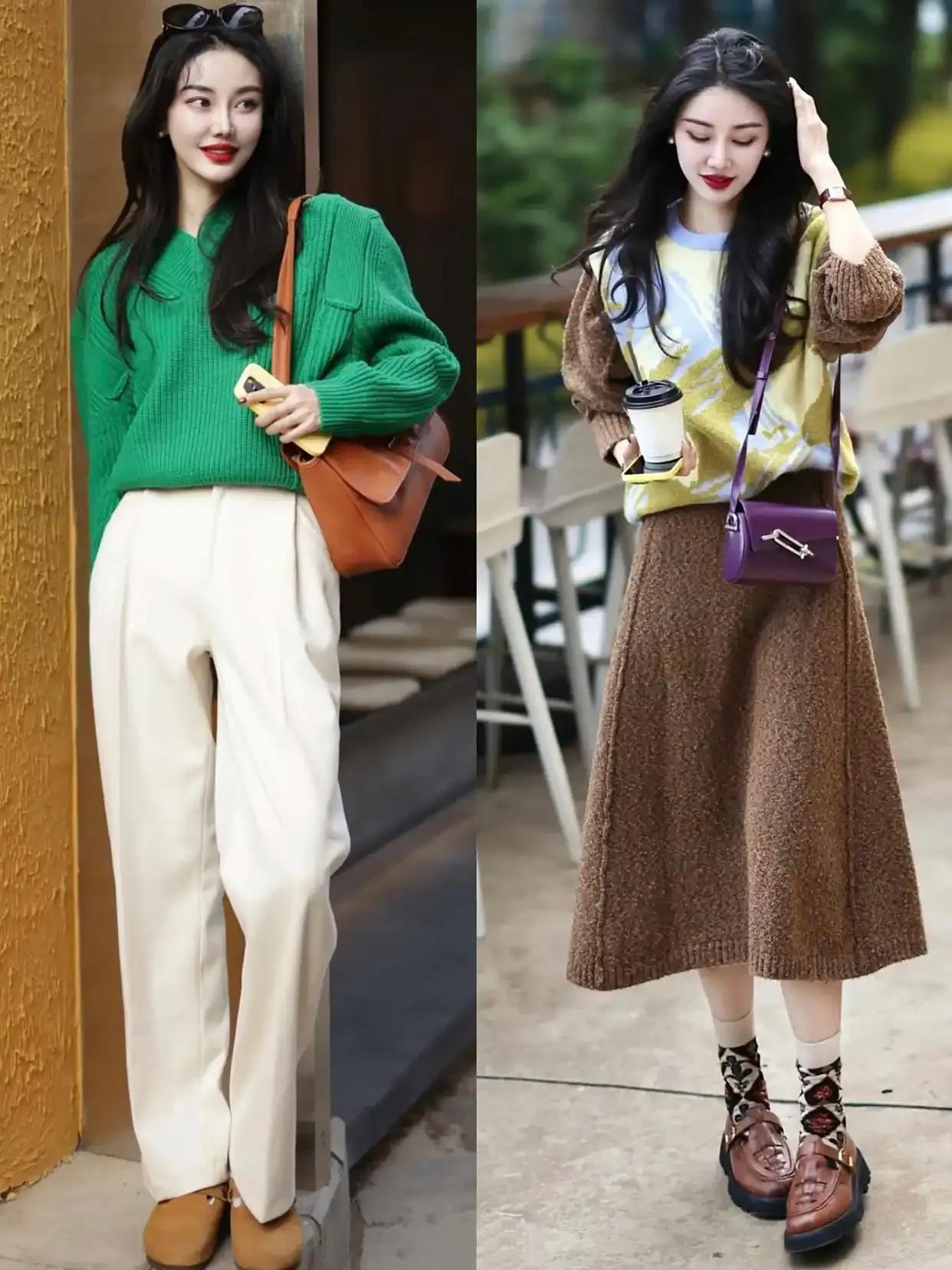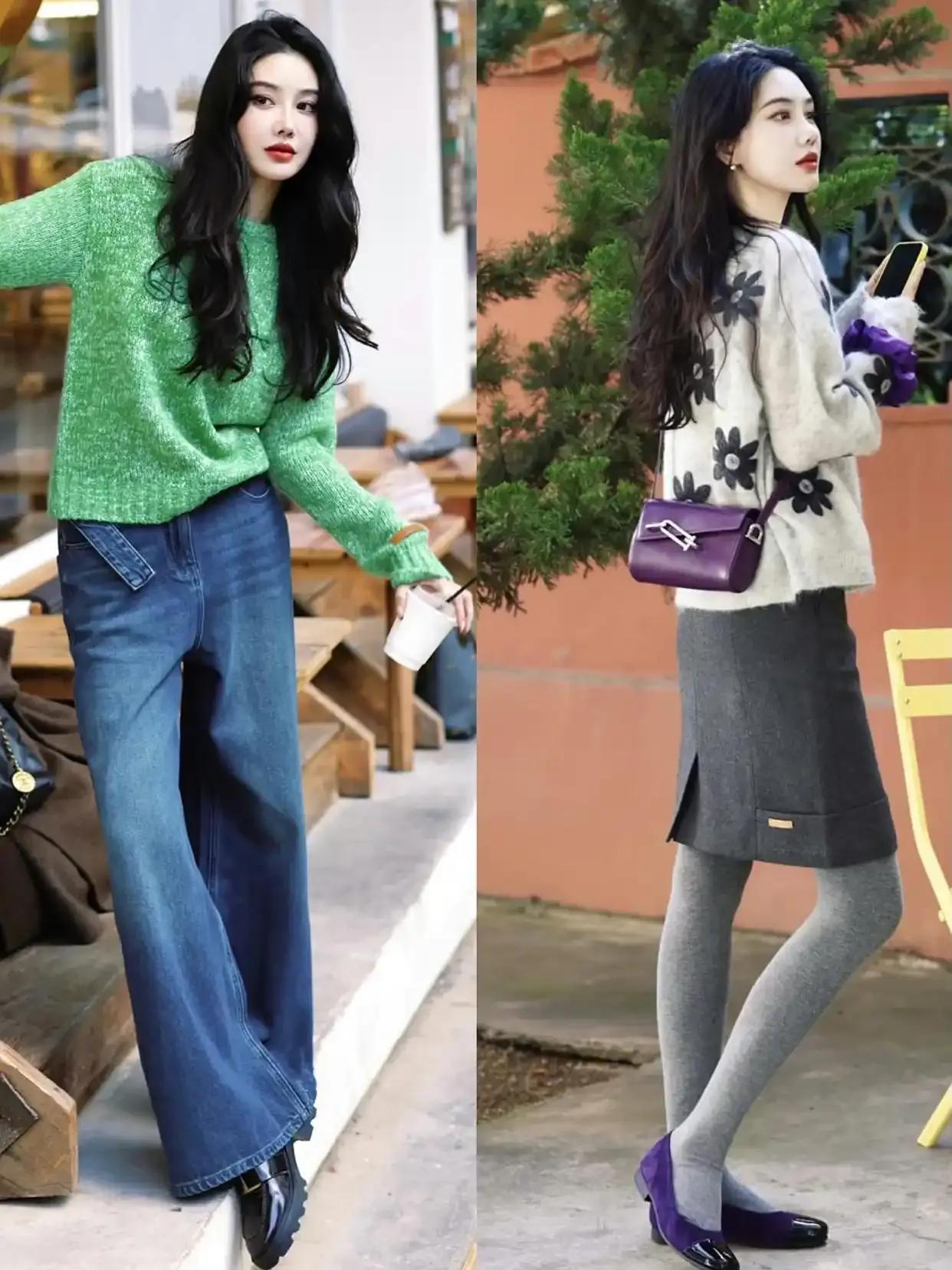 年轻貌美的你当然可以尝试彩色系的毛衣,不过颜色也尽量是浅色系,例如上面浅绿色的毛衣搭配牛仔阔腿裤,脚上穿着一双皮鞋,这样的穿搭拍出来的照片就很出片。
