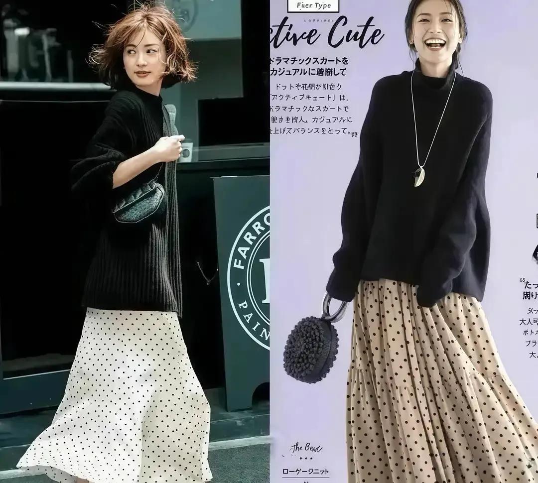 想让自己的造型比较有女人味,又有点甜美风的气质升利配,可以选择白色的波点半身裙或者是杏色的波点半身裙,来搭配上黑色的针织毛衣,这样的穿搭还能遮肉显瘦。伞状款式的半身裙对于腿粗胯宽有小肚腩的女性非常友好。