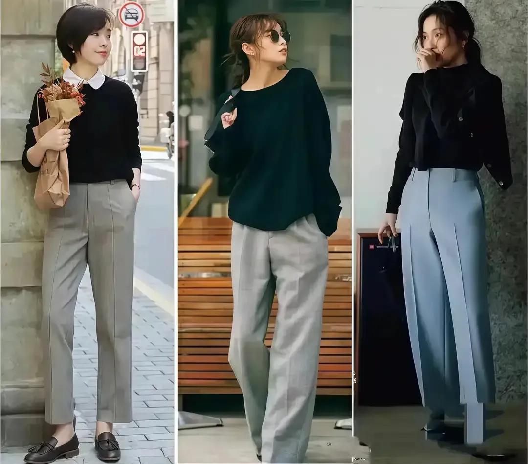 职场女性很推荐你选择一条挺阔有型的西装裤来搭配黑色的毛衣,裤子颜色可以是燕麦色,也可以用雾霾蓝的西装裤来搭配,这样的配色更显高级。