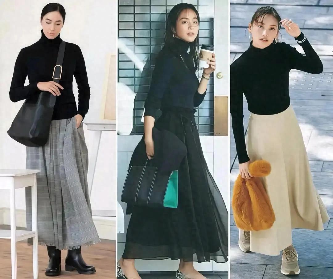 好比上面用的就是黑色的毛衣,搭配伞状款式的半身裙,就能轻松 get 到女性的温柔感,而且得体又大方。