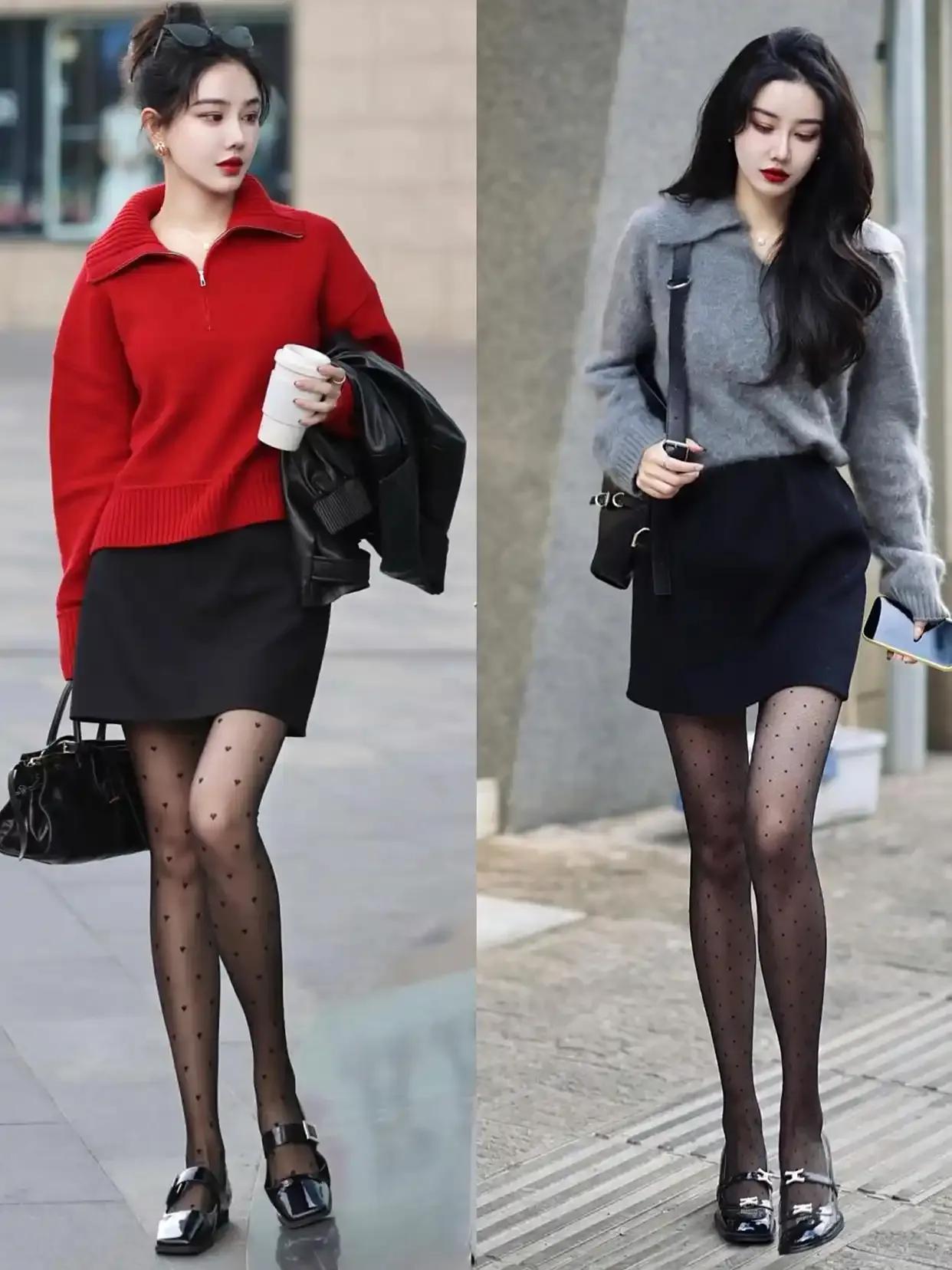 当然,你也可以用浅灰色的毛衣搭配上黑色的半身裙,加上波点的丝袜,脚穿黑色方头单鞋,这样下半身失踪的穿搭技巧更能呈现出你大长腿的优势,抢眼又吸睛。
