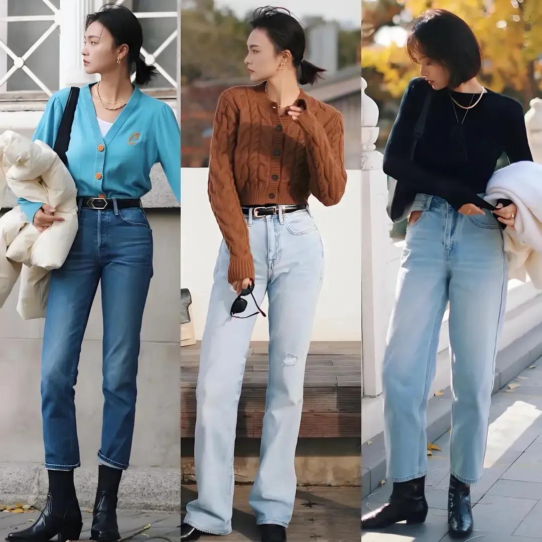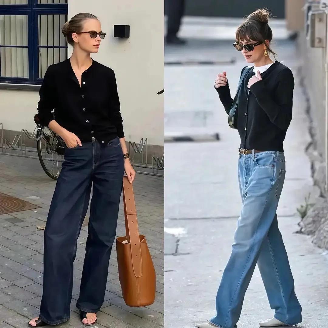 牛仔裤天生就拥有时尚元素,穿在身上就能使得穿搭者变得洋气,同时休闲。我们可以用短款的黑色针织开衫内搭白色 T 恤,加上这条比较有垂坠感的蓝色牛仔直筒长裤,就能形成上短下长的搭配方式,使得穿搭者的身材比例形成三七分,显高显瘦。